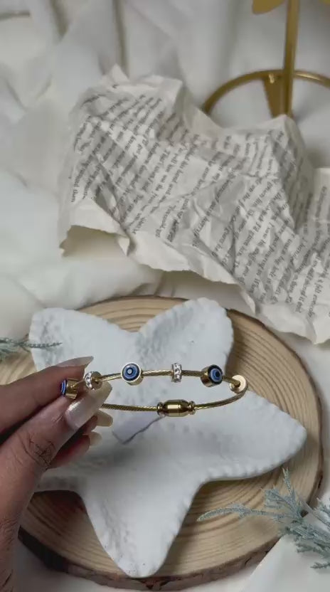 Add a touch of elegance and protection to your everyday style with this Evil Eye Magnetic Lock Bangle. Designed with a sleek cable-style silhouette, this bracelet features classic evil eye motifs symbolising positivity, protection, and good energy.